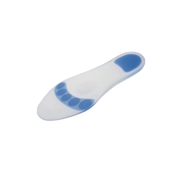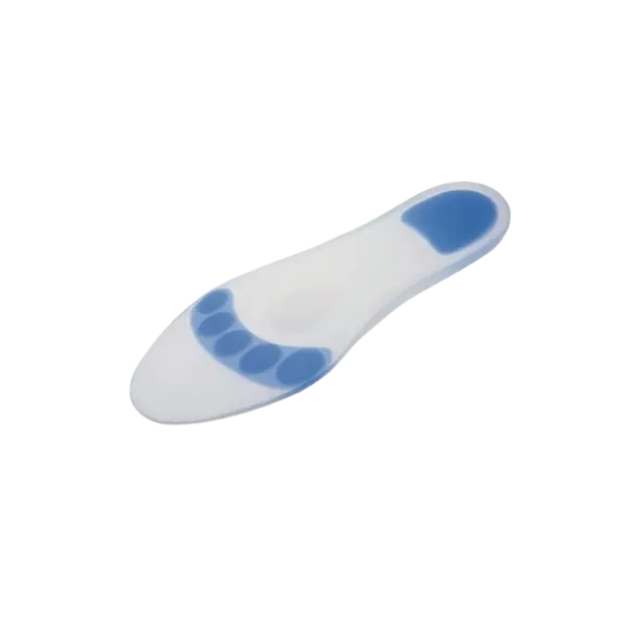 protect.Silicone inlay, ayağın ön, orta ve arka bölümünde oluşan hassasiyetleri yastıklamaya ve basıncı dengelemeye yardımcı medikal silikon tabanlıktır. Entegre “soft spots” (mavi konfor bölgeleri) hedefli yumuşatma sağlar; metatarsal destek ped ve alçak profilli boyuna (longitudinal) kavis desteği ile adım konforunu artırır. Cilt dostu, kaymaz ve yıkanabilir yapısı sayesinde günlük kullanımda hijyenik ve pratiktir.