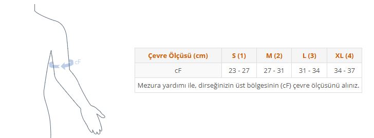 | cF | 23 - 27 | 27 - 31 | 31 - 34 | 34 - 37 | Mezura yardımı ile, dirseğinizin üst bölgesinin (cF) çevre ölçüsünü alınız. |